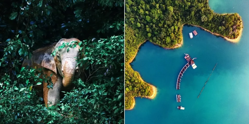 Ses montagnes karstiques, hautes et abruptes, évoquent des autels de pierre veillant sur la vallée. En contrebas, le vaste lac émeraude de Rajjaprabha (Cheow Lan) s’étire comme une mer intérieure, silencieuse et hypnotique.