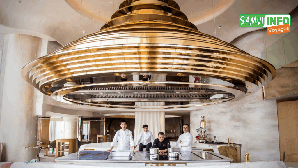 Perché au 61ᵉ étage de l’hôtel Lebua at State Tower, Chef’s Table Bangkok propose une expérience culinaire inédite, alliant gastronomie française contemporaine et dîner-théâtre. La salle à manger luxueuse, avec 46 places, est orientée vers la scène : une cuisine ouverte où chaque chef devient acteur, préparant devant vous un menu en sept plats créatifs et raffinés.