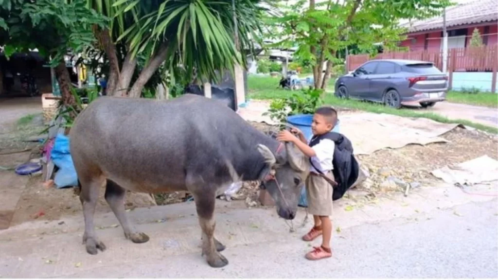 Depuis deux ans, Fluke, élève de CE1 à l’école du temple Wat Nong Som, dans le district de Khao Yoi (province de Phetchaburi), parcourt quotidiennement les 800 mètres qui séparent sa maison de l’école en compagnie de son buffle, affectueusement surnommé Kalamae.
